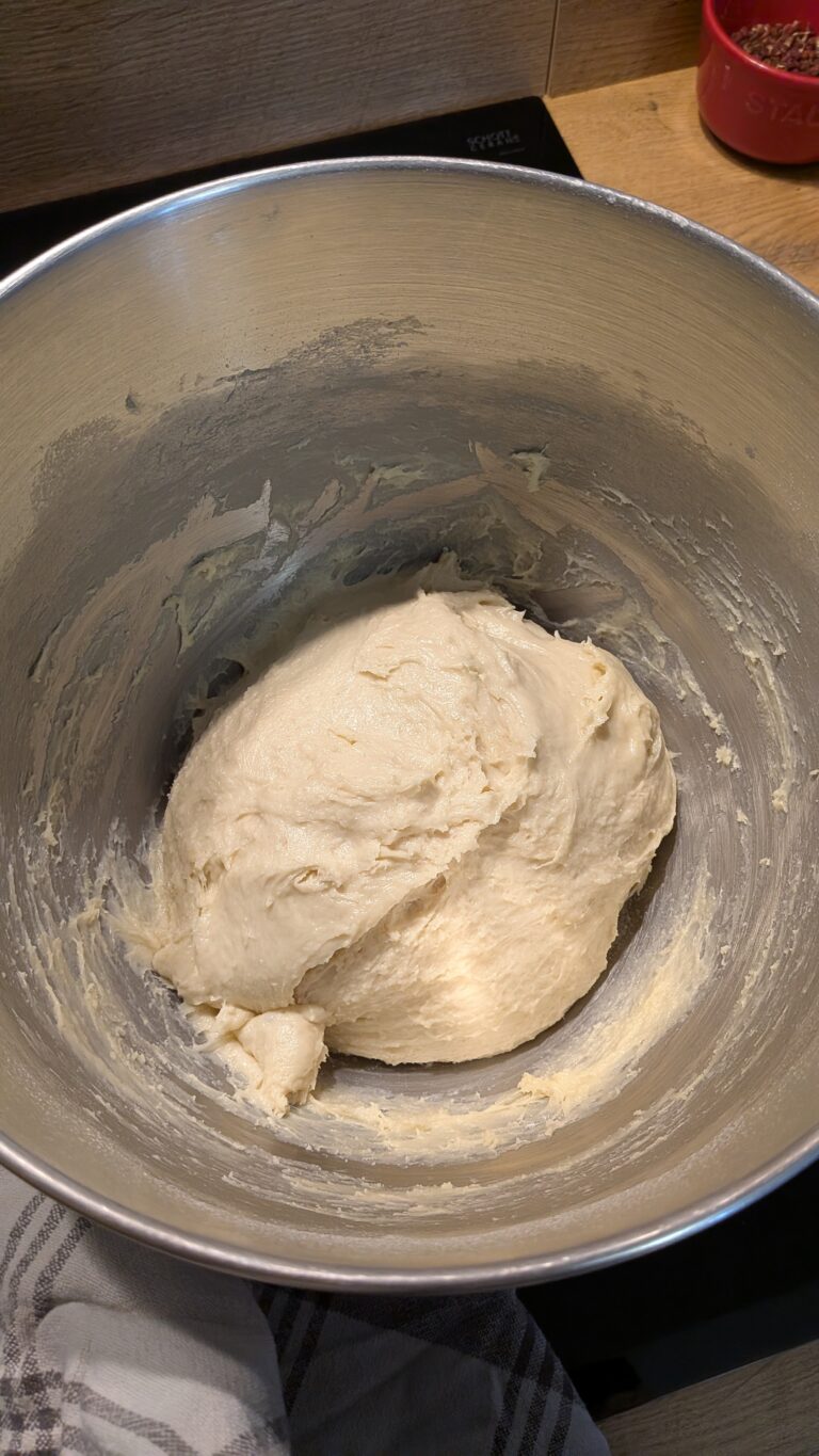 Gradually add the softened butter, kneading until fully incorporated. The dough should be smooth, elastic, and slightly sticky.