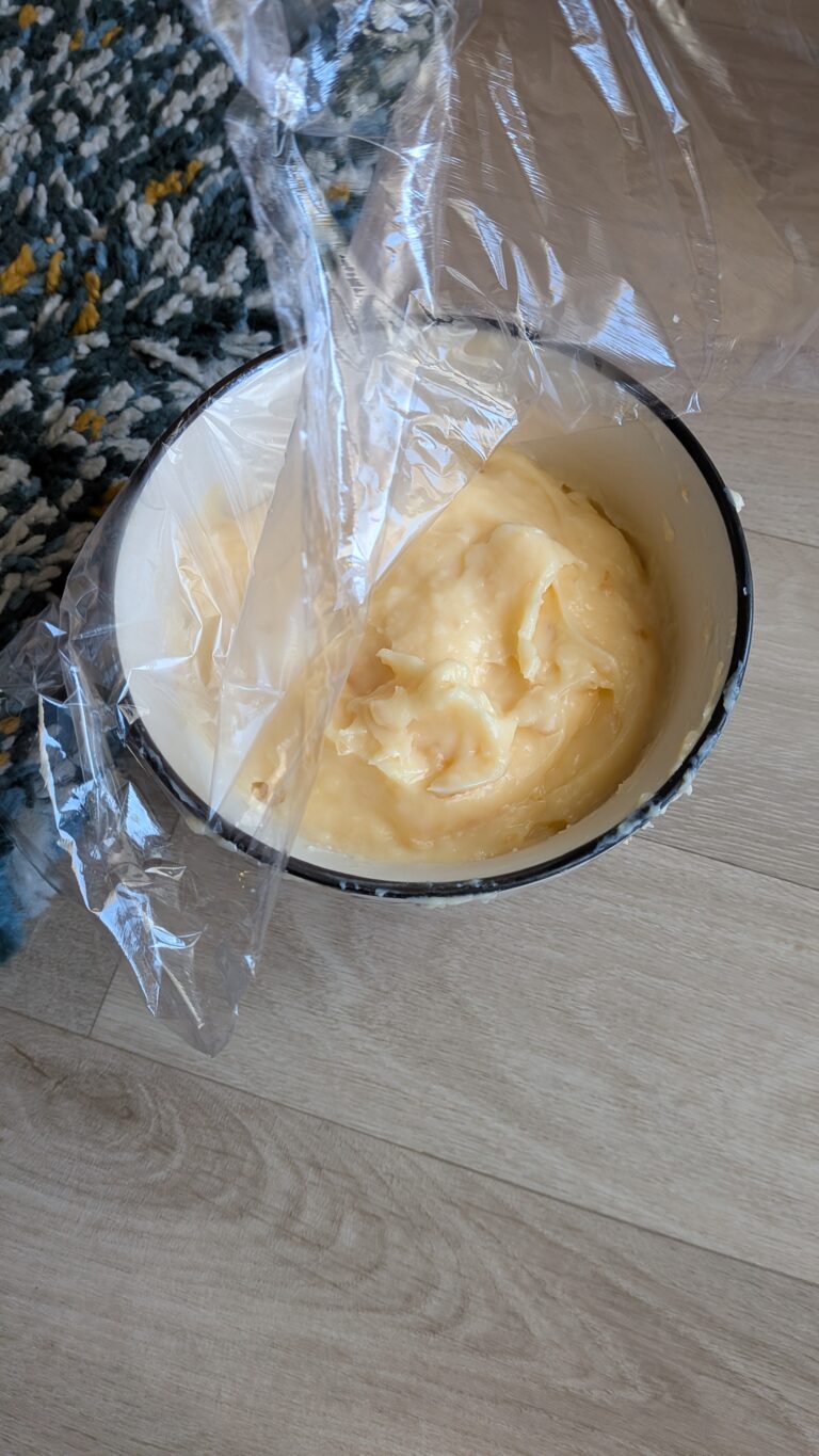 5. Remove from heat, stir in butter, then cover directly with cling film touching the surface and let cool completely in the fridge. This is the classic French method to keep the crème smooth and prevent a skin from forming.