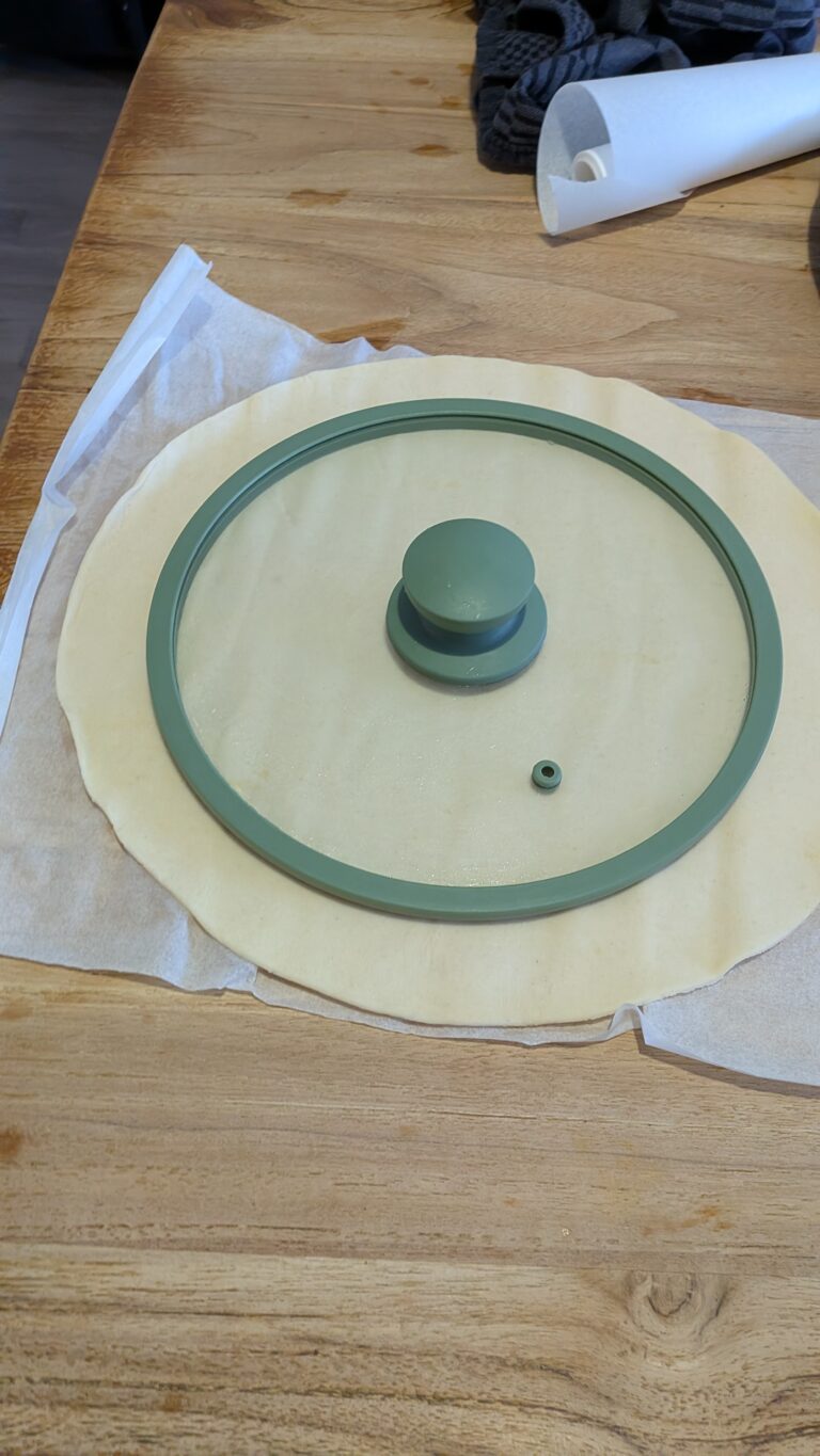 - Bottom round: Cut your first puff pastry circle using a pot lid or template and place on a parchment-lined baking tray.