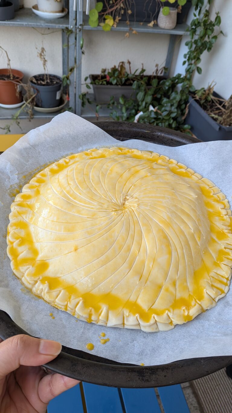 The Galette des Rois Frangipane is a northern French Epiphany classic, traditionally enjoyed on January 6 but widely available throughout January. Made with all-butter puff pastry, almond cream (crème d’amande), and often enriched with crème pâtissière (pastry cream), this galette hides a fève (small figurine) inside. The lucky finder becomes king or queen for the day.