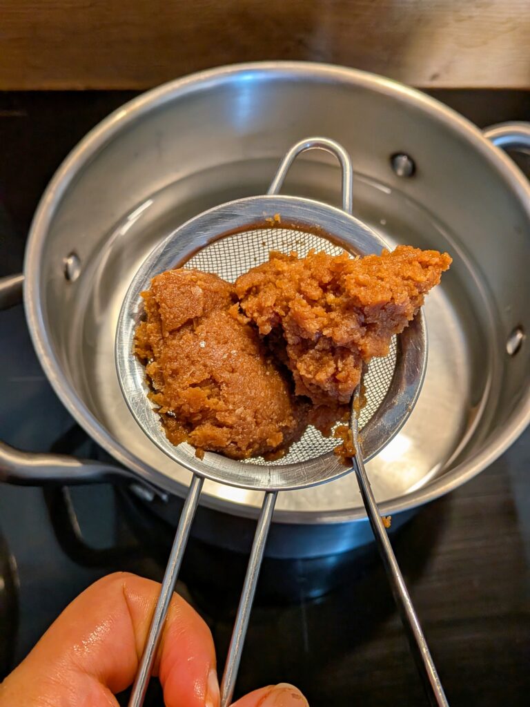 I pass the miso paste through a sieve directly into the pot to avoid clumps. Any pieces that don’t pass through the sieve are removed.