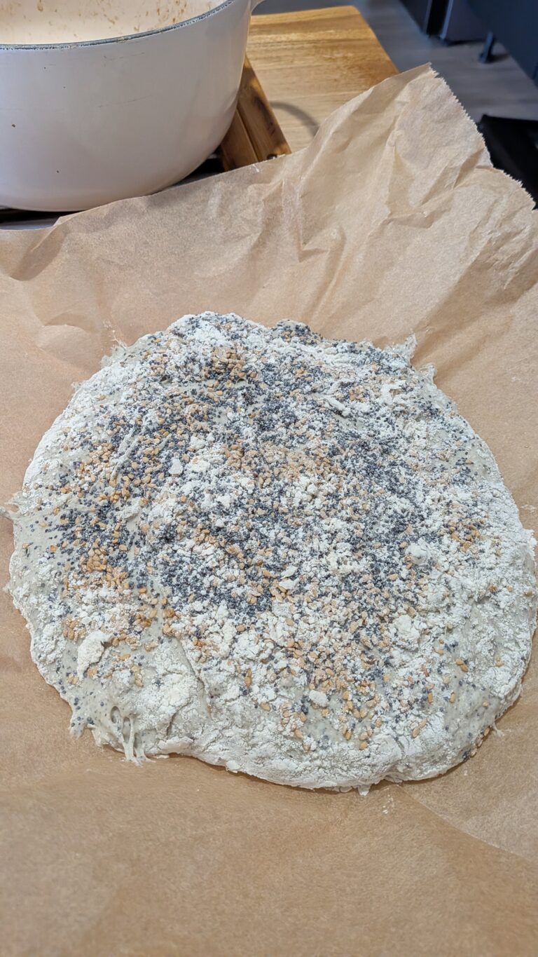 Sprinkle seeds on the bottom of the baking parchment or pan for a 360° seed-crusted loaf.