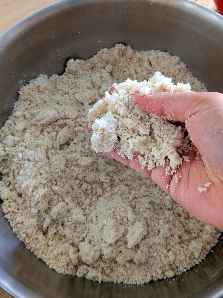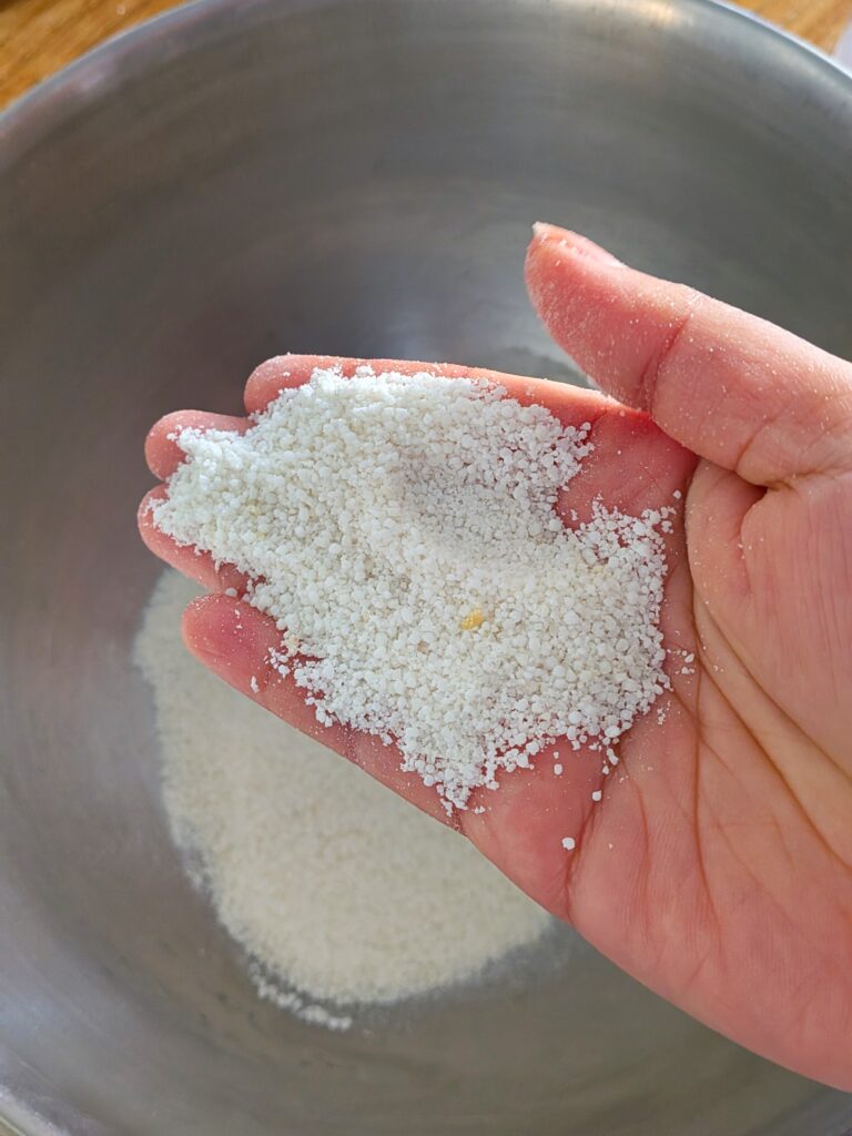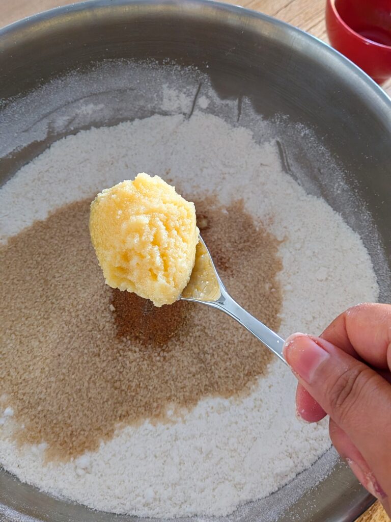 • Rub the mixture between your palms until it forms small clumps — this helps the ghee and sugar coat the rice evenly and the semolina adds body and crispness to the final selroti.