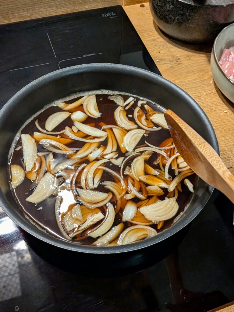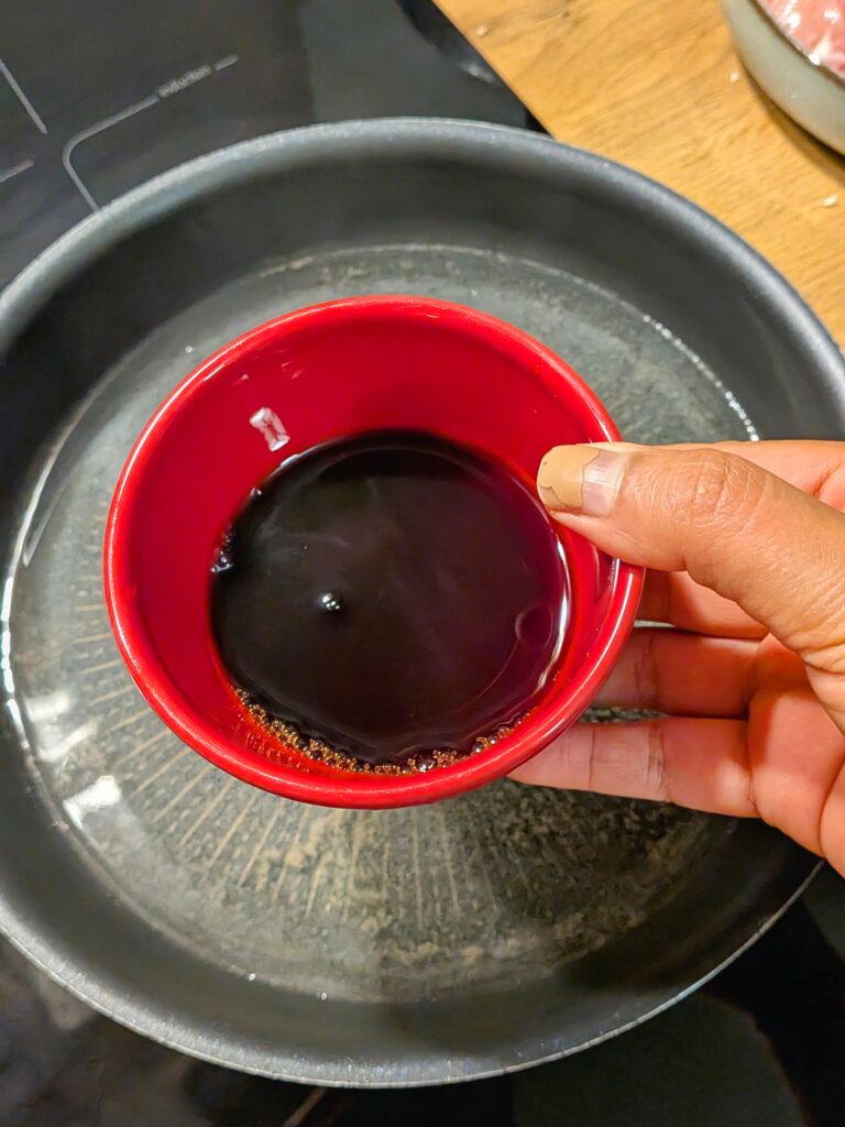 - In a small pan, combine your chosen broth base (dashi stock, or water + powdered dashi) with soy sauce, mirin, and sugar. Bring to a gentle simmer.